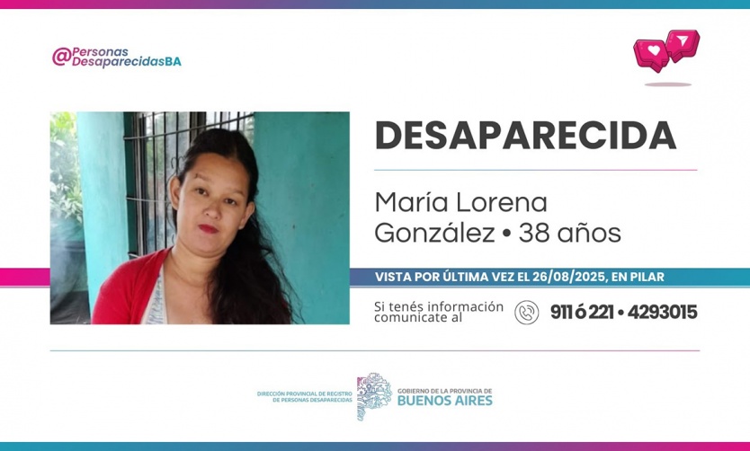 Una mujer de 38 años permanece desaparecida desde el martes 26 de agosto. De acuerdo a la información oficial, fue vista por última vez en la localidad de Fátima, Pilar, cuando abordó un colectivo de la Línea 511 con destino a Manzanares.