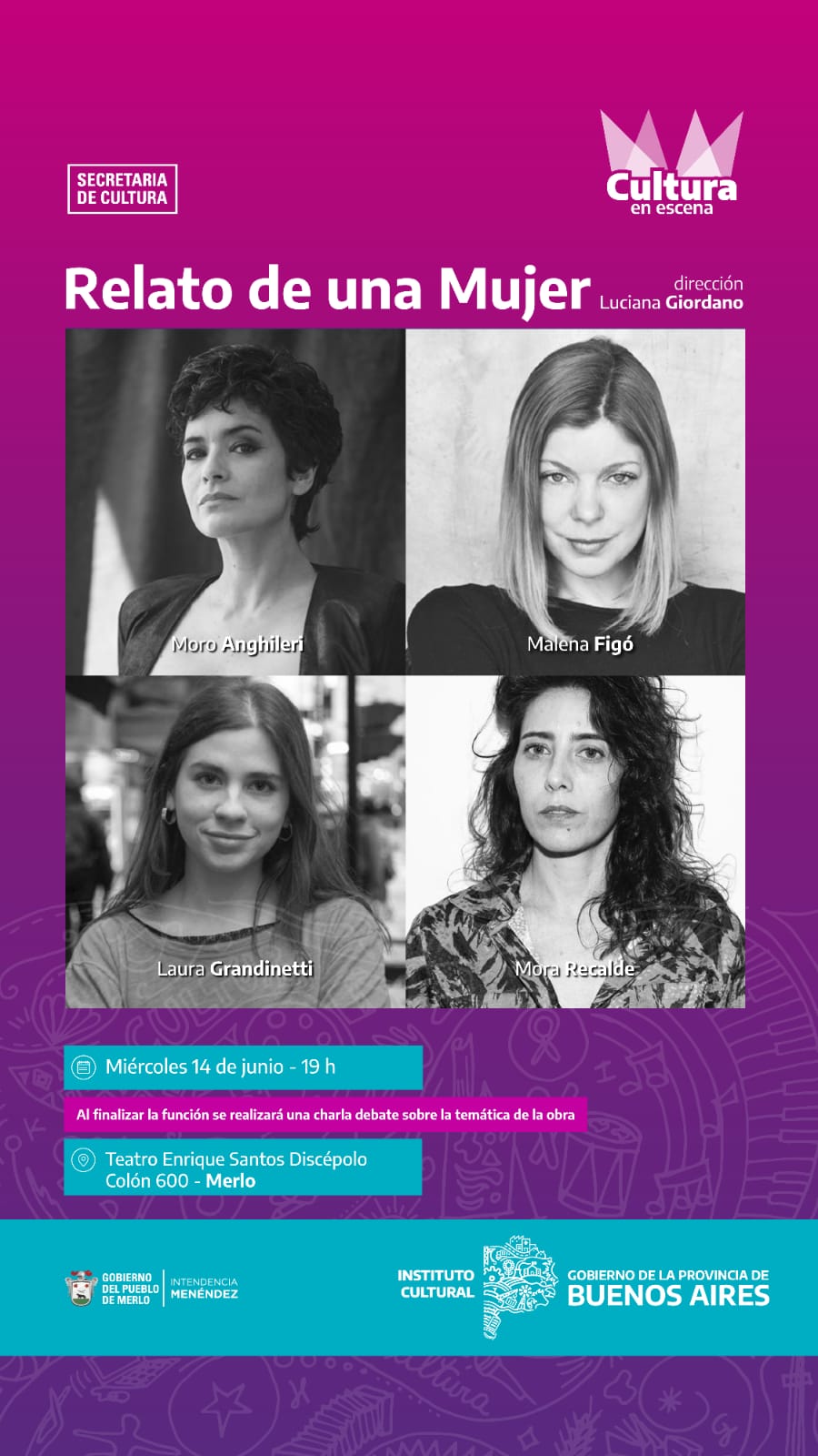 “Relato de una mujer”, es un producto escrito y dirigido por Luciana Giordano, el cual es interpretada por Mora Recalde, Laura Grandinetti, Moro Anghileri, y Malena Figó. La obra teatral cuenta sobre la violencia de género y los posibles caminos para desarmar ese círculo de dolor.