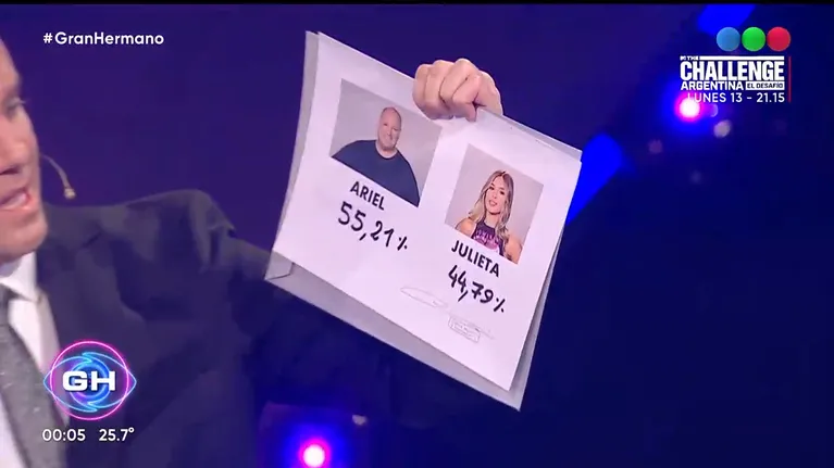 Finalmente, el mano a mano se dió entre Julieta y Ariel. Antes de que termine la noche, Del Moro reveló que quién se convertía en el nuevo eliminado con el 55,21% de los votos era el “BigAriel”, como lo llamaban sus fans. Mientras que la “Princesita”, cosechó el 44%.